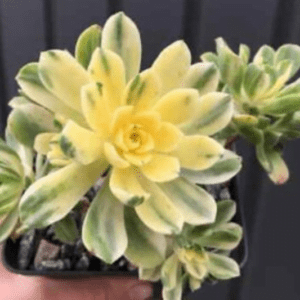 VARIEGATED AEONIUM (BARE ROOTED)Variegated Aeonium is a striking succulent with rosettes of variegated leaves in shades of green yellow and cream. It’s drought-tolerant and perfect for containers or rock gardens.